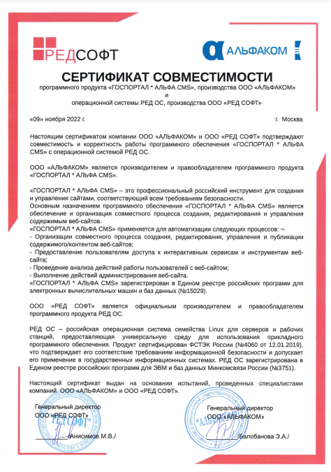 программного продукта Альфа Платформа («ГОСПОРТАЛ * АЛЬФА CMS»), производства ООО «АЛЬФАКОМ» и операционной системы РЕД ОС, производства ООО «РЕД СОФТ»